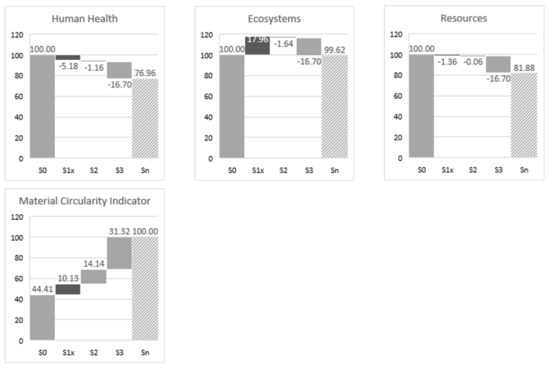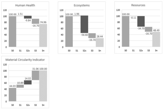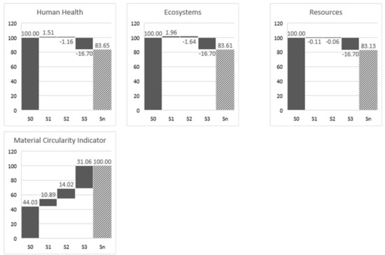 The comparison between the results of MCI and LCA is carried out using a new comparative approach in order to overcome the differences between each set of results presented. Traditionally, benefit-type analysis of MCI is expressed in an absolute value range between 0 and 1, whereas the cost-type results of LCA are given in impact concentration or equivalence units and commonly normalized against the most impactful scenario (on 0–100 scale). To overcome these differences, the results are jointly interpreted and visualized using waterfall charts. LCA values of circularity strategy scenarios are shown in increment values relative to the impacts of the baseline scenario, and MCI scores are normalized to the net circularity value (Sn)—a sum of combined incremental values of improvement strategies and MCI scores of the baseline scenario.