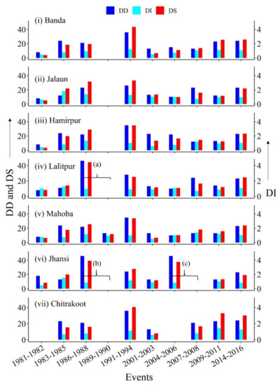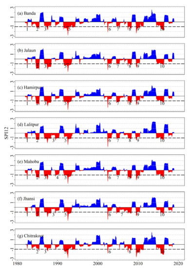 - Thomas, T.; Jaiswal, R.K.; Nayak, P.C.; Ghosh, N.C. Comprehensive evaluation of the changing drought characteristics in Bundelkhand region of Central India. Theor. Appl. Clim. 2015, 127, 163–182. [Google Scholar] [CrossRef]