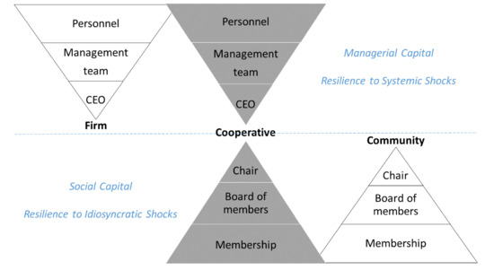 In the context of rural Africa, community-based organizations (as depicted by the bottom-up pyramid on the right hand side of Figure 1) and colonial or parastatal firms (as depicted by the top-down pyramid on the left hand size of Figure 1) have so far prevailed over cooperative enterprises (as depicted by the two pyramids at the center of Figure 1). The importance of managerial capital as a mean to sustain collective action has long been recognized. [32,33,34] were among the first to recognize that unless a group is small, collective action requires substantial management capacity. More recently, [35,36] demonstrate that managerial capital constitutes the missing link between small and medium sized enterprises and markets and suggest that the pervasive business failure in developing countries can be attributed to a general lack of managerial capital. In line with this, the conceptual framework in Figure 1 postulates that managerial capital is the missing element in the evolution of contemporary community-organizations into fully-fledged cooperative enterprises. The rise of cooperatives that combine social and managerial capital is especially important to ensure rural resilience in the face of idiosyncratic as well as systemic shocks.