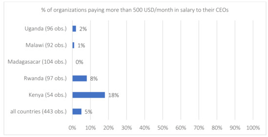 According to [35,36] pervasive agribusiness failure among SMEs in the context of developing countries is attributable to a general lack of managerial capital. Figure 2 shows that only five percent of sampled organizations employed professional managers at the time of the survey. Here, a professional manager is a CEO or director who receives a salary from his/her organization of at least 500 USD per month. In contrast, most agricultural cooperatives in Europe do have a professional manager [40]. Again, there is some variation between countries and the percentage of organizations employing professional managers is higher in Kenya (18 percent) and Rwanda (8 percent) and zero in Madagascar.