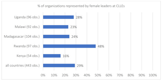 In the absence of professional managers, farmer-owned organizations are usually managed by rural and traditional leaders, which tend to be men [17,27]. This means that efforts to strengthen the managerial capital of rural leaders are unlikely to ensure gender-equity in the running of farmer-owned organizations nor social inclusion. Figure 3 shows that only about a third of organizations selected female leaders to participate in the CLLEs and benefit from related management training. Again, variation between countries exists and in Rwanda half of the rural leaders that received managerial training were women. In contrast, the CLLE held in Kenya involved only 16 percent of female trainees. In line with previous findings, we would thus expect Malawian, Malagasy and Ugandan organizations—which are the least likely to have either professional management or female leadership—to be less resilient during the COVID-19 crisis.