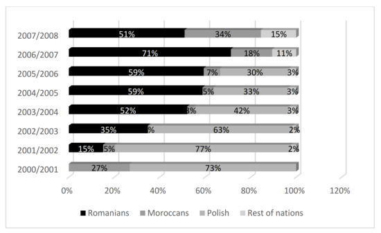 At the beginning of 1990s, Spain and Romania were two almost unconnected European countries, located at opposite ends of the continent. At that time, few could have imagined that, thirty years later, more than 650,000 Romanians would live in Spain, as the second-largest immigrant community of the country. The history of this migration starts as early as the first years after the fall of the dictatorial regime of Ceaușescu in Romania. It evolved slowly during the 1990s but burst into a substantial flow during the 2000s [14]. Primarily economic, Romanian migration to Spain has mainly been developed through wide migration networks [15]. Romanians have inserted themselves into niches of the Spanish economy prone to migrant work: construction, domestic work, agriculture, and tourism [14]. Their presence in agriculture went rather unnoticed until the beginning of the new millennium. It was after 2002, when Romania signed a bilateral agreement with Spain, that Romanians became a reference migrant population for Spanish agriculture, especially in the strawberry fields of Huelva.