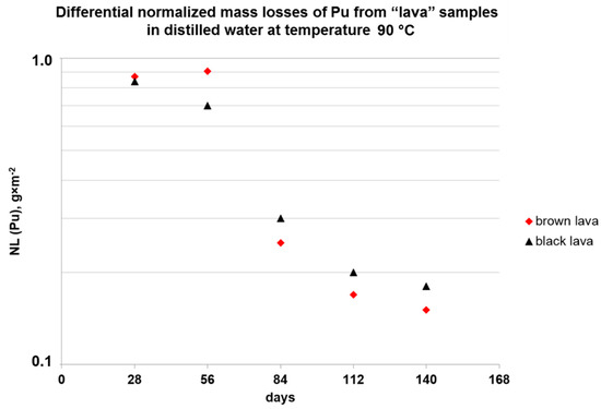 The normalized mass losses of Pu for Chernobyl black and brown “lava” are shown in Table 3 and Figure 3. Black and brown “lava” did not demonstrate essential differences in Pu mass loss. The total NLPu (distilled water, 90 °C, 140 days) was 2.2 and 2.3 g/m2 for black and brown “lava”, respectively. The normalized mass losses of Pu from corium matrix are shown in Table 3 and Figure 4.