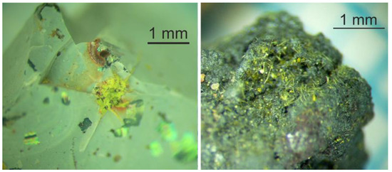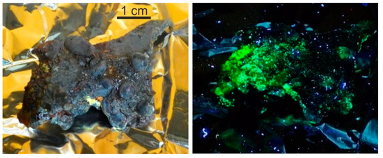 Chemical alteration of Chernobyl “lava” has been observed inside the “Shelter” after several years after the accident. Some new-formed phases identified are UO3 × 2H2O (an analog of epiianthinite), UO4 × 4H2O (an analog of studtite), UO2CO3 (an analog of rutherfordine), Na4(UO2)(CO3)3 and sodium carbonates [7,18]. During the dry storage of Chernobyl samples (corium and “lava”) in laboratory conditions, chemical alteration and formation of secondary uranyl minerals (“yellow phases”) were clearly observed for most of them. Fluorescence of secondary phases in UV-light confirms that uranium in these phases partially oxidized from U (IV) to U (VI) (Figure 5).