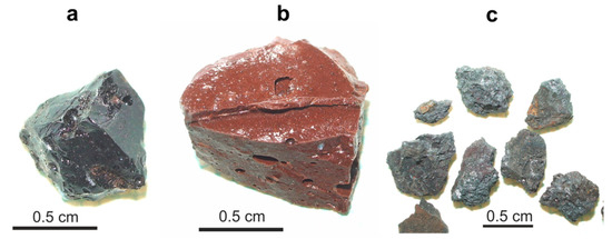 Chernobyl samples before leaching experiments: black “lava” from room 217/2 (a), brown “lava” from steam discharge corridor used for alteration experiment (b) and fragments of corium from room 305/2 (c).