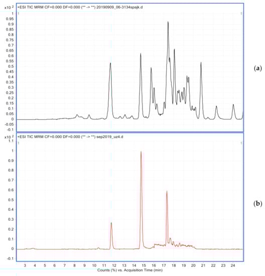 TIC chromatograms of (a)−spiked apple sample (0.01 mg/kg) and (b)−analyzed apple sample from organic production.