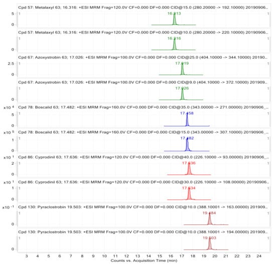 LC-MS/MS analysis: The detection and quantification were performed by the liquid chromatography tandem mass spectrometry equipped with the electrospray ionization (LC(ESI)-MS/MS), 6410B Agilent Technologies. In terms of chromatographic conditions, a Zorbax Eclipse XDBC18 column (50 mm × 4.6 mm id 1.8 µm) was used and kept at 25 °C. The mobile phase consisted of the gradient using methanol with 0.1% formic acid (solvent A) and 0.1% formic acid in water (solvent B), with the following gradient: 0 min−90% B; 2 min−90% B; 15 min 20% B; 20 min−15% B; 25 min−5% B and then returning to the initial conditions in 5 min. The total run time was 30 min. The flow rate of the mobile phase was 0.4 mL/min and the volume of 5 µL of sample extract was injected into the column. In terms of mass spectrometry, the MS source temperature was set at 350 °C, nitrogen gas flow 10 L/min and nebulizer pressure 40 psi. The data acquisition in the multiple reaction monitoring mode (MRM) was optimized after direct infusion of each pesticide. The instrument uses MassHunter software (vB.06.00, Agilent Technologies, Santa Clara, CA, USA) for the acquisition and quantification [30].