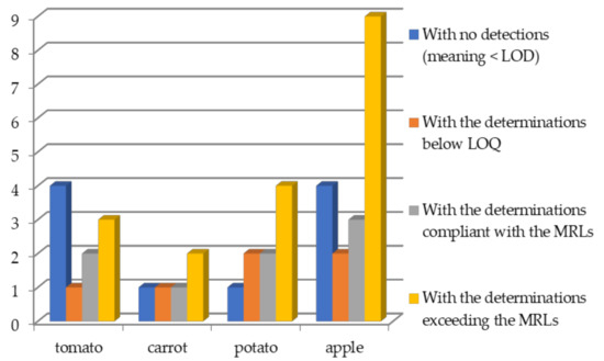 The results presented in Figure 3 and Figure 4 show the pesticide residues in the investigated samples from the organic (Figure 3) and conventional production (Figure 4) with no detections (meaning<LOD), the samples with the determinations below LOQ, the determinations compliant with the MRLs and the determinations exceeding the MRLs.