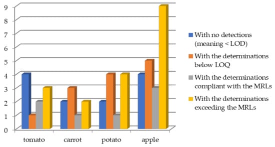 The apple samples from the conventional production contained four pesticide residues, with azoxystrobin concentration over MRL of 0.01 mg/kg [32]. The conventional tomato and potato did not contain pesticide residues, all detections were under the LOQs. The carrot sample contained fluopyram and difenoconazole with residues being below the MRLs.