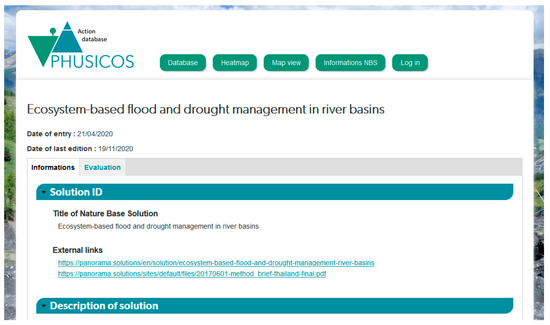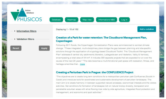 PHUSICOS platform proposes three interfaces to explore the dataset. In addition to these interfaces, an information tab gathers documents of interest concerning NBSs and adding a new solution is possible thanks to questionnaire form. Finally, the “solution page” gives access to all available metadata and also to the evaluation restitution for the chosen solution.