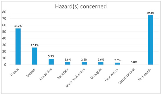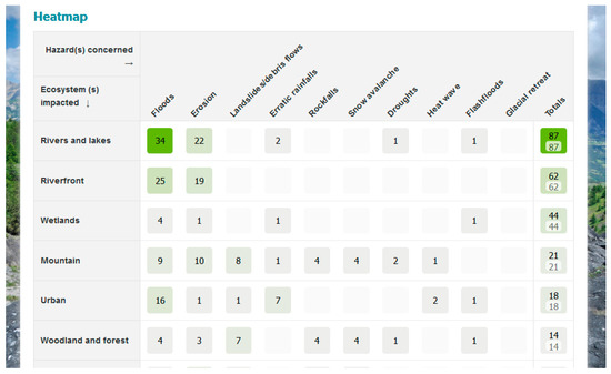 A heat map (Figure 4) allows different and in depth browsing of data. Currently, five fields are available for the heat map (“hazard concerned”, “ecosystem impacted”, “assets exposed”, “other challenges”, and “Sustainable Development Goals addressed”).