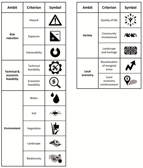 List of symbols used and correspondence with criteria and ambits.
