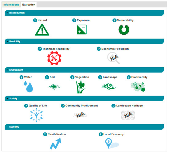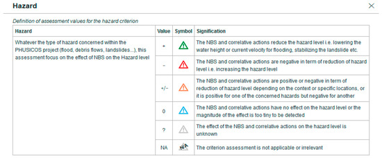 A comprehensive framework for the assessment of NBSs in context of natural hazard risk mitigation and ecosystem services monitoring has been designed [9,18]. This framework will be used to assess the NBSs implemented at demonstrator sites, but it is not adapted to evaluate NBSs collected through databases and literature review due to the lack of detailed data. In consequence, the detailed assessment framework developed by Autuori et al. [18] is composed by nested levels of descriptors. For the PHUSICOS platform, the frame has been simplified and adapted. We consider that the second level of the framework (“Criteria”) does not require too detailed data while being sufficiently informative for our analysis (Table 3).