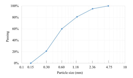 An impact crusher was adopted for the production of the recycled sand from waste aerated blocks (ABs) and clay bricks (CBs). Then, standard sieves, including 0.075, 0.15, 0.3, 0.6, 1.18, 2.36 and 4.75 mm, were used to separate the recycled sand into different grain sizes. The grain size distribution of the recycled sand used in the mixes was adjusted the same as the river sand, whose grain size distribution is shown in Figure 1. The basic physical properties of ABs sand and CBs sand are shown in Table 1. It can be seen from Table 1 that the bulk density of the CBs sand is almost twice that of the ABs sand. A small difference can be seen in the apparent density, whereas the water absorption of ABs sand is 34.64%, which is about 17 times of that of the river sand, showing the ABs sand possess higher voids in the micro–structure of the grains. This higher porosity is responsible for a higher water absorption.
