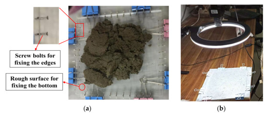 The fresh mortar was cast into a plate specimen of 200 × 200 × 8 mm3. To make the mold, two Polymethyl methacrylate plates of 300 × 300 × 8 mm3 were used. The upper plate was produced with a square cavity of 200 × 200 mm2. The surface of the lower plate was made rough by sanding for fixing the bottom of the mortar. Screws were fixed in the inner sides of the cavity of the upper plate in order to secure the sides of the mortar. After pouring the fresh mortar into the mold, the specimens were placed at room temperature of 23 ± 2 °C and humidity of 60% for three hours. A total time of 3.5 h was spent from pouring to finishing the specimen for DIC, which includes the spraying of white emulsion paint and then the spraying of black paint for speckles. The purpose of the experiment design is to simulate the cracking behavior of mortar when it is used as plastering mortar. The arrangement of the mortar casting and taking pictures is shown in Figure 2.
