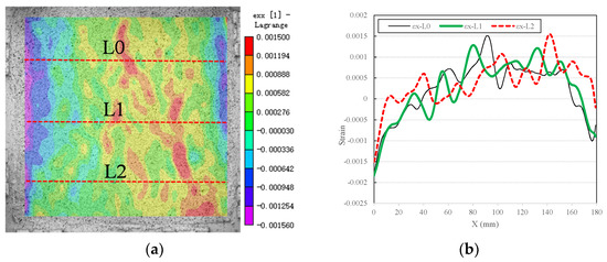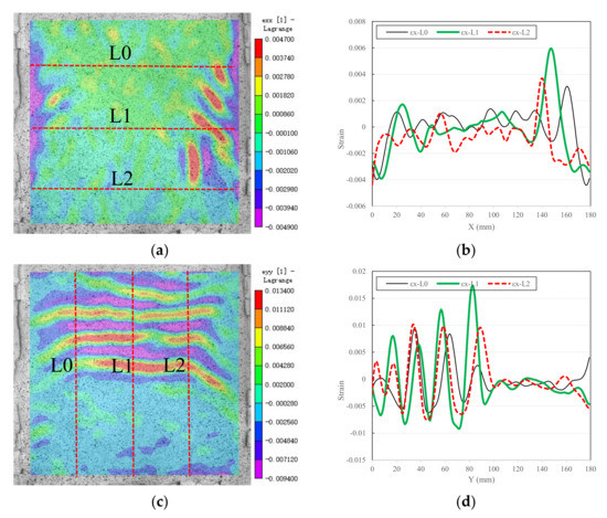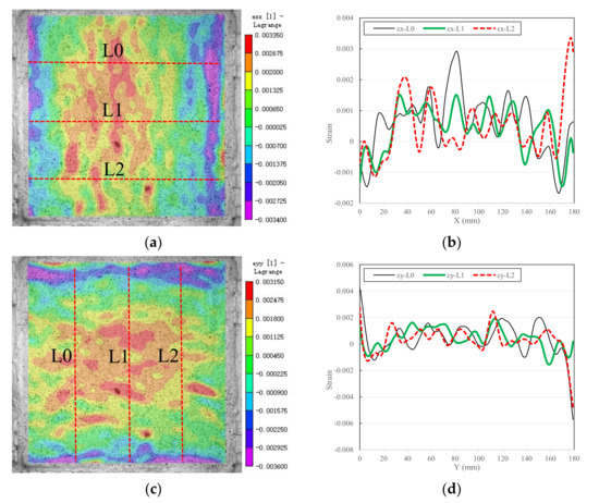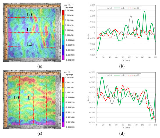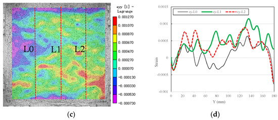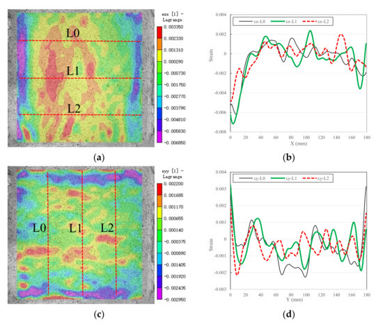 Similarly, the strain of Y–direction (vertical), εy, is shown in Figure 3c. The strain values along the three lines L0, L1 and L2 are shown in Figure 3d. It shows that the strain values fluctuate within ±0.002, and the highest strain value occurs at the middle upper position of the specimen.