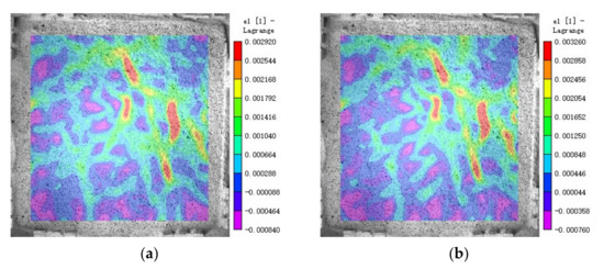 The first principal strain fields are shown in Figure 4a,b for half an hour and one hour of hot air blowing, respectively. The first principal strain shows the possible crack propagation on the surface of the specimen. While comparing Figure 4a,b, a similar strain concentration pattern can be found, and the highest value increased from 0.0026 to 0.0033. However, no visible cracks are seen on the surface of the specimen.