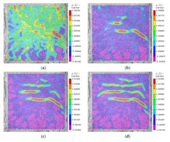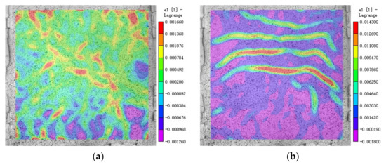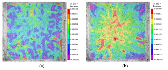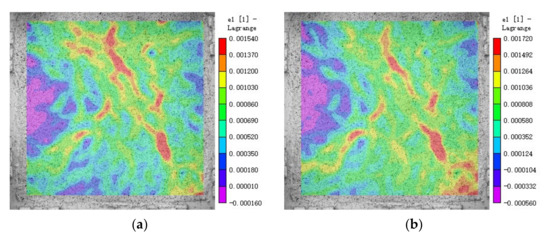 From the first principal strain distribution in Figure 8a, no crack is visible at half an hour. Whereas, when the time reaches one hour, four obvious cracks are visible on the surface of specimens with a distinctive map–crack pattern. The highest strain value and the distinct cracking can be attributed to the additional water [24].