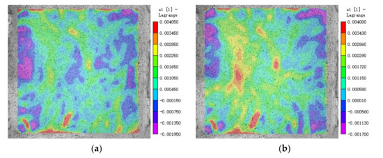 For CBs2, the fluidity was maintained with additional water, and a small amount of water was needed to adjust the fluidity of the mortar to the same as the control. Random strain concentration zones can be seen in strain distribution of εx and εy, as shown in Figure 11. The strain concentration is mostly seen at the center of the specimen when checked in both directions. The strain fluctuates within ±0.004, which is slightly higher than the control.