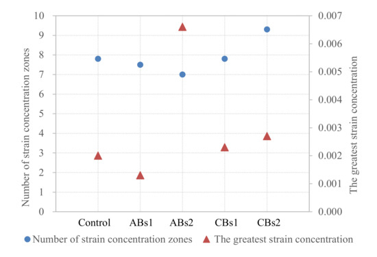 In order to compare the number of strain concentration zones and the greatest strain concentration of five groups, the average of six values of each group is obtained and shown in Figure 13. From Figure 13, it can be easily found that ABs1 has fewer number of strain concentration zones and lower strain concentration values compared to the control. This means a lower risk of cracking, which is due to the internal curing effects of recycled sand. For ABs2, the strain concentration zones developed into cracks, which can be observed during testing. CBs1 has similar values to the control for both the number of strain concentration zones and the highest strain concentration values. CBs2 should have higher risk to crack because there are more strain concentration zones and higher strain concentration.