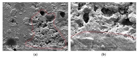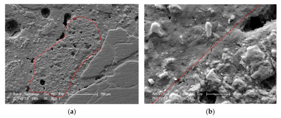 From Figure 14a, it can be seen that ABs sand particles contain micro–pores that are responsible for the higher water consumption needed to maintain the flow of the fresh mortar. In Figure 14b, the pores are clearly visible in the upper part of the picture, and it is convenient to tell the size of the micro–pores, which are as small as a few microns and as big as 50 microns. The micro–pores are the reason why the mortar containing ABs sand has an extremely higher water requirement.