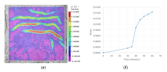 In order to understand the development of plastic shrinkage crack with time, the curve of maximum strain at cracks with time is drawn in Figure 16f. According to the curve, the maximum strain of the specimen increases relatively slowly before 35 min. At 40 min, the maximum strain has a sudden growth, and then slows down after that. The results show that the cracks appear for the first time in ABs2 when the hot air blows for 40 min, and then the cracks gradually propagate and new cracks appears continuously. Most of the cracks propagate horizontally and a few vertically.