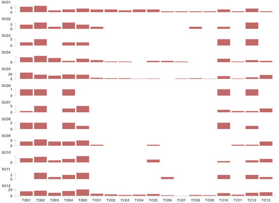- In Figure 4: The distribution of transformation drivers (TD) across operating sectors (SC) and selected technologies (TC): e.g., Driver TD02 was the most important driver of change in SC01, and the most important responding technology was T10.