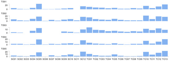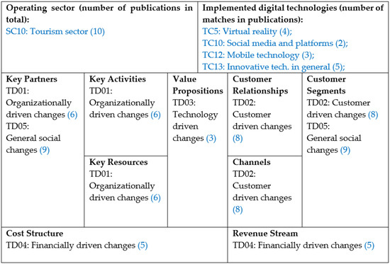 - In Figure 3: The distribution of operating service sectors (SC) in relation to transformation drivers (TD) and selected technologies (TC); e.g., SC10: The tourism sector was mostly reported to be driven by TD05 and TD02. The SMEs in this service sector relied on TC13 and TC5.