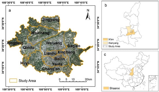 Location of the study area. (a) Map of the study area; (b) map of Shaanxi Province; (c) map of China.