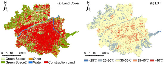 Land cover classification and LST in 2019. (a) LC classification; (b) LST.