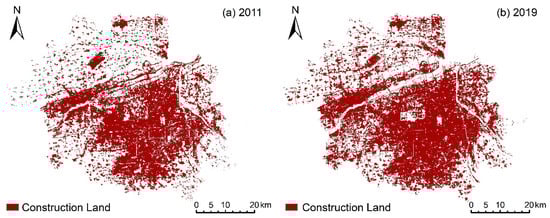 Construction land distribution in 2011 and 2019. (a) The distribution in 2011; (b)The distribution in 2019.