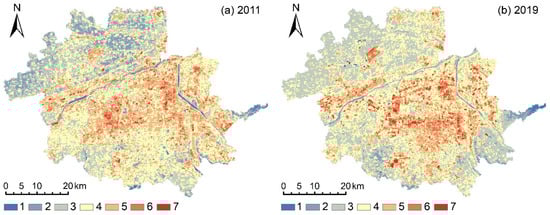 LST levels in 2011 and 2019. (a) LST levels in 2011; (b)LST levels in 2019.