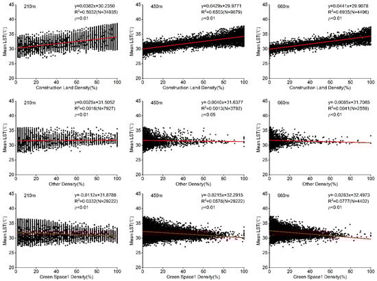 Based on the results of LC classification and LST in 2019, LC types that significantly affect LST changes at different scales were identified. In three different sizes of grid, the correlation analysis of the proportion of each LC type and the mean LST was carried out (Figure 5). Since the construction land is mainly artificial impervious surfaces such as buildings and roads, and has strong heat absorption capacity, the proportion of construction land is positively correlated with LST. Additionally, with the increase in grid size, the correlation is gradually enhanced. In contrast, the proportion of green space 2 was negatively correlated with mean LST, and this correlation also increased with the increase in grid size. The area proportion of water is also negatively correlated with LST, especially in the size of 210 × 210 m grid, where the correlation is even higher than in green space 2. However, unlike construction land and green space 2, their correlation gradually decreases with the increase in grid size, and the R2 at 660 m grid size dropped to 0.2979. In addition, green space 1 and “other” have no effect on the change in LST.