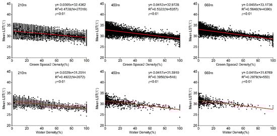 Fitting the relationship between land cover density and mean LST in 210, 450 and 660 m grids.