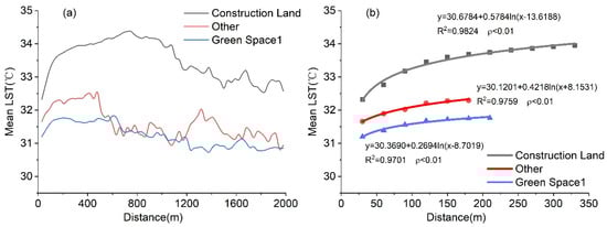 Previous results showed that green space 2 and water have an obvious cooling effect, but their specific cooling capacity is not clear. Therefore, the results of LC and LST in 2019 were used to explore the cooling distance and intensity of these LC types. The results of the cooling distance analysis showed that, within the cooling distance, with the increasing distance from green space 2 and water, the mean LST of construction land, “other” and green space 1 has a raised trend (Figure 6 and Figure 7). The fitting results of average LST and distance within the cooling range were very ideal (R2 > 0.97). The LST of construction land rises to the inflection point when the distance from the green space 2330 m, and the inflection points of “other” and green space 1 appear at 180 and 210 m, respectively. The LST of construction land rises to the inflection point when the distance from the water bodies 180 m, and the inflection points of “other” and green space 1 appear at 150 and 210 m, respectively. Green space 2 has a larger cooling distance than water, especially when the construction land is cooled, which is 150 m longer than that of water. However, the mean LST of construction land, “other” and green space 1 increased by 3.84, 2.19 and 1.66 °C, respectively, in the cooling range of green space 2, and these values were 4.32, 3.94 and 2.93 °C, respectively, in the cooling range of water. Thus, the water has a stronger cooling intensity.