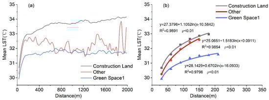 Cooling distance analysis of water. (a) The distance to water and its corresponding mean LST; (b) the relationship between distance and corresponding mean LST.