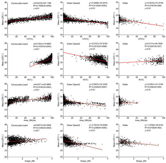 From the above results, it can be concluded that construction land, green space 2 and water can affect the change in LST. The LPI, AI, Shape_MN and Area_MN of these LC types in 2019 were calculated based on a 1 km grid, and the influence of different landscape configurations on the thermal environment was analyzed (Figure 8). The results showed that the LPI of construction land had a strong positive correlation with LST with R2 equals 0.7095. The Area_MN and AI of construction land are also positively correlated with LST, while the Shape_MN was independent of LST. The four landscape indices of green space 2 were negatively correlated with LST, and the LPI has the strongest correlation, with R2 reaching 0.5193. AI, Area_MN and Shape_MN of green space 2 had a relatively low correlation with LST: R2 was 0.2572, 0.2405 and 0.2286, respectively. The LPI of the water body was negatively correlated with LST (R2 = 0.2767), and other indexes had no significant correlation with LST.