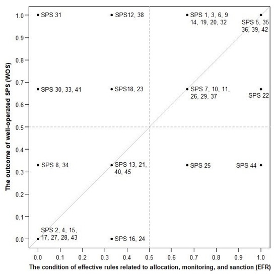 As a triangular form, one should plot the sufficient conditions (or configurations thereof) against the outcome [65] (p. 47). Therefore, for each case, we plotted the membership score in the EFR against the membership score in the WOS, as depicted in Figure 1. In this figure, SPSs, located on or above the main diagonal, are consistent with sufficiency since they fulfill the requirement for sufficiency (EFR ≤ WOS) as indicated in Section 3.3. Nonetheless, not all of these cases are relevant to discussing why EFR is sufficient for WOSs since some cases show weak rules (cases with EFR < 0.50). Thus, we focused on the cases located in the upper right corner of Figure 1 (0.50 < EFR ≤ WOS) to clarify how EFR accounts for WOS, as shown in Section 5.1.