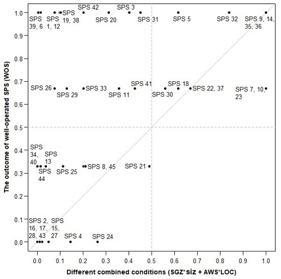 By contrast, it reveals from Figure 1 that five cases are below the main diagonal. These cases are responsible for the lower level of consistency (0.902). However, Ragin [73] highlights that in fsQCA, it is usually challenging to obtain ideal sufficiency relations due to the nature of social science data—some flexibility should be considered. Hence, we suggest that SPS22, being closest to the main diagonal, supports the sufficiency relation. It is also worth noting that SPS25 and SPS44 are contradictory cases since they contradict the sufficiency relation—that is, although EFR is present, a WOS is not achieved. Schneider and Wagemann [66] emphasize that researchers should draw attention to contradicted cases. In Section 5.1, we discuss why such contradicted cases exist.