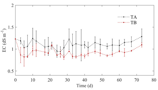 The electrical conductivity (EC) profiles for both treatments (number of replications = 3).