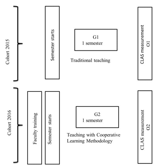 Subsequently, before the start of the first semester of 2016, in January, the 12 teachers took part in a training course in cooperative methodology. Finally, in July 2016, at the end of the semester, the CLAS scale was applied (O2) to G2.