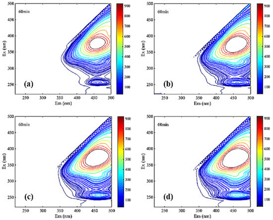 It can be seen from Figure 7 that two main peaks were identified in the fluorescence spectrum of each solution DOM. One main peak was located in region III related to the fulvic acid substance, and the other main peak was located in region V related to the humic acid substance.