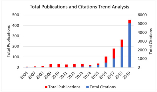 As a first step, an analysis in terms of number of publications and citations was performed in the Web of Science (WoS) online platform. Figure 3 depicts an exponentially growing trend in publications in the past 5 years, with close to 83% of all publications being between 2015 and 2019, with a total of 1262 publications. It can also be seen a slight growth between 2008 and 2010 but followed by a decrease in publications until 2015. As for the publications, the same trend can be observed in the last 5 years, with 95% of citations registered between 2015 and 2019, with a total of 9695 citations.