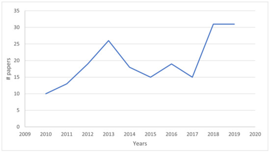 An analysis based on the publication trend of life cycle extension strategies was carried out considering the following search engines: Science Direct and Web of Science, in the period 2010–2019. Figure 4 represents the results of research showing non-linear behavior: the number of publications relating to the life cycle extension strategies varies from year to year, maintaining an increasing trend over the last few years.