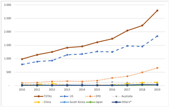 A patent analysis was carried out using Lens Patent as the main database for our purpose. The research on trends was based on patents over the last 10 years (from 2010 to 2019). A first analysis was conducted on the Life cycle extension topic for the industry and manufacturing sector with the following keywords: “Circular economy”, “Lifetime extension”, Remanufacturing, Refurbishment AND equipment, Refurbishment AND machinery, Refurbishment AND “industrial machine”, “Predictive maintenance”, “Predictive maintenance” AND equipment, “Predictive maintenance” AND “industrial machinery”, “Preventative maintenance”, “Preventative maintenance” AND equipment, “Preventative maintenance” AND “industrial machine”. These keywords are in line with the ones used for the analysis of trends in publications and citations and were selected with the aim to avoid too generic results, not pertinent to the purpose of this work. Our search strategy was related to the “granted” patent that is mentioned in the dataset under the following fields: title, abstract, full text and claims. We use a Boolean research strategy to get a representative sample excluding replication of patents. We obtained a final sample with 16,409 patents. Figure 6 highlights the number of patents is clearly increasing over the years, with an increasing marginal number in the last 2 years. The figure also shows a high concentration of countries where the US (73% of the overall selected patents), Europe (16%) and Australia (5%) seem to have the most prominent role followed by China, South Korea, and Japan. The most prominent keywords in terms of the number we find in this analysis are “Preventative maintenance” (30.8%), “Preventative maintenance” AND equipment (20%), Refurbishment AND “industrial machine” (16.34%), Remanufacturing (11.6%), “Predictive maintenance” (8.34%), “Predictive maintenance” AND equipment (5.92%), Refurbishment AND equipment (3.79%), “Lifetime extension” (1.5%), “Circular Economy” (1.2%).