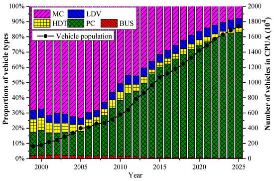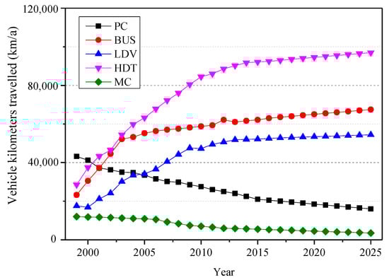 Studies have shown that the mean annual VKT data of PCs are related to its retention rate [25], meaning that the average annual VKT data will decrease with the increase of its retention rate. It is well known that the retention rate of PC in cities will continue to increase. Therefore, the correlation between the mean average VKT and retention rate of PC for each city can be established based on the corresponding data between 1999 and 2015, then the average VKT of PC for 2016 to 2025 can be estimated based on the retention rate of PC from 2016 to 2025 obtained above. The annual VKT by HDTs, BUSs, and LDVs were related to the local business activities and increased with economic growth. The annual VKT by HDTs, LDVs, and BUSs for 2016–2025 were thus predicted using the method of elasticity coefficient. The annual VKT of MCs would decrease in the next future years with the restriction on motorcycle applied in each city. The data of the predicted annual VKT by different types of vehicles are exhibited in Figure 3.