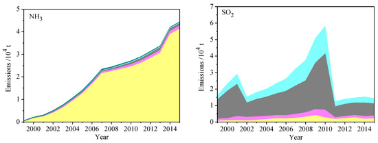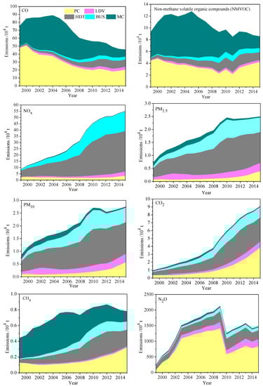 The missions of ten pollutants (CO, non-methane volatile organic compounds (NMVOC), NOx, PM2.5, PM10, CO2, CH4, N2O, NH3, and SO2) from vehicles in the CPUA between 1999 and 2015 were calculated based on Equation (1), as shown in Section 2.1, and the inter-annual change tendency are shown in Figure 4.