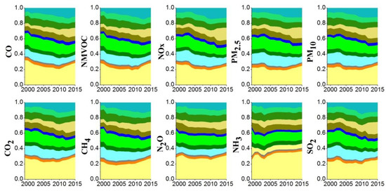 The distribution of emitted pollutants by city is shown in Figure 5. The city that contributed the most to total vehicle pollutant emissions in the CPUA was Zhengzhou, followed by Luoyang, Shangqiu, and Zhoukou between 1999 and 2015. The contributions of vehicular ten pollutant emissions of Zhengzhou to the region remained above 20.68%, 18.97%, 19.49%, 19.07%, 19.44%, 22.35%, 18.22%, 25.55%, 26.53%, and 19.91%, respectively, during the years of this research (Figure 5). In addition, the contribution of vehicle emissions in Zhengzhou to the total regional emissions continued increasing, reaching 28.56%, 28.37%, 24.26%, 4.72%, 25.48%, 29.04%, 27.61%, 31.32%, 36.44%, and 25.59%, respectively, in 2015, as the vehicle population in this city has increased greatly in recent years. The vehicle population increased substantially in Shangqiu and Zhoukou, especially MCs and HDTs, so the contributions of these ten vehicular pollutant emissions in these cities increased. The contributions of CO, NMVOC, NOx, PM2.5, PM10, CO2, CH4, N2O, NH3, and SO2 vehicle emissions in Luoyang and Jiaozuo decreased as the growth trends of the vehicle population in these two cities slowed.