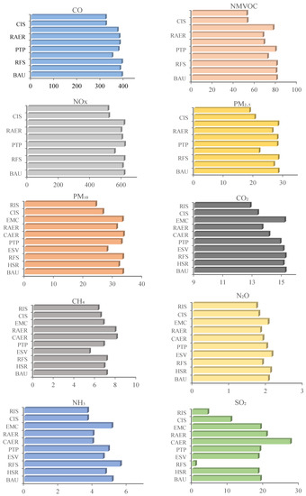 Vehicle emissions under the different scenarios. BAU, business as usual; HSR, high standard replacements; ESV, eliminating substandard vehicles; RFS, raising fuel stands; PTP, public transport priority; EMC, eliminating motorcycles; CAER, conservative alternative energy replacement; CIS, conservative integrated scenario; RIS, radical integrated scenario; RAER, radical alternative energy replacement.