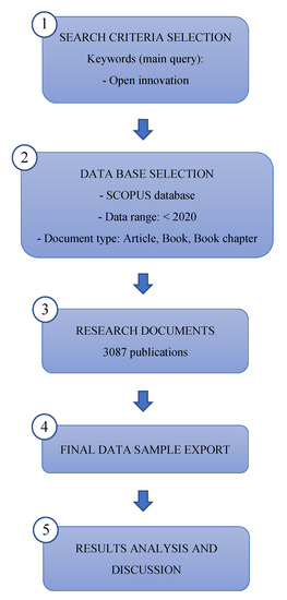 In this research, the indicators analyzed were the yearly distribution of published documents, as well as the productivity of the authors, countries, and research institutions. Figure 1 shows the steps followed during our research on open innovation.